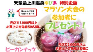 天童最上川温泉ゆぴあ特別企画として、売店をご利用いただいたお客様に、 ① 売店で1,000円以上お買上の方先着…