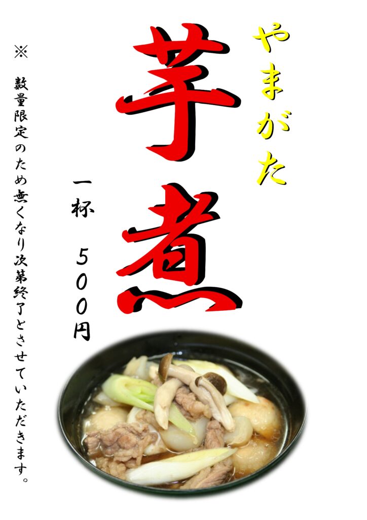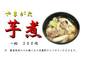 【最上】やまがた名物「芋煮」限定販売(11/15~16)! 2025年11月14日 最終更新日時 : 2025年11月14日 ゆぴあ管理人 秋の味覚! 山形名物「芋煮」を限定販売いたします。 11月15日(土)~16日(日)各日午前11時~ ※無くなり次第終了となります。 ゆ~キッチンにて1杯500円で販売します。 FacebookXBlueskyHatenaCopy